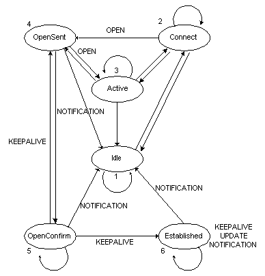 OPENCONFIRM: Neste estado o BGP aguarda pela mensagem de KEEPALIVE e quando esta for recebida, o estado segue para ESTABLISHED e a negociação do peer é finalmente completa. Com o recebimento da mensagem de KEEPALIVE, é acertado o valor negociado de Hold Time entre os peers. Se o sistema receber uma mensagem tipo NOTIFICATION, retorna-se ao estado de IDLE. O sistema também envia periodicamente, segundo o tempo negociado, mensagens de KEEPALIVE. No caso da ocorrência de eventos como desconexão ou intervenção do operador, retorna-se ao estado de IDLE também. Por fim, na ocorrência de eventos diferentes aos citados, envia-se uma mensagem NOTIFICATION, retornando ao estado de IDLE.
