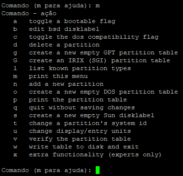 Caso tenha duvidas sobre alguns comandos digite “m” e pressione enter, será mostrada uma tabela com todos os comandos, exemplo:
