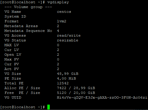 Digite “vgdisplay” para mostrar as propriedades do grupo, em Free PE/Size veremos que temos disponível o valor do disco que adicionamos ao grupo.