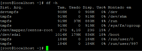 digitando o comando “df-h” veremos que a partição alterou seu tamanho de 27G para 47G(nesse exemplo).