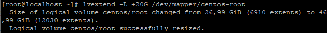 No exemplo utilizaremos o comando “lvextend -L +20G /dev/mapper/centos-root“