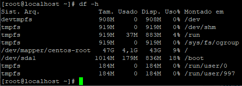 Nesse exemplo utilizamos o sistema de arquivos XFS, o comando xfs_growfs é somente utilizado para esse tipo de sistema, caso utilize EXT utilize o comando resize2fs (exemplo: resize2fs /dev/mapper/centos-root).