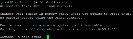 Digite fdisk /dev/sdb para formatar o novo disco.