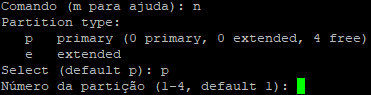 Digite “n” para criar uma nova partição, digite “p” para identificar a partição como primaria.