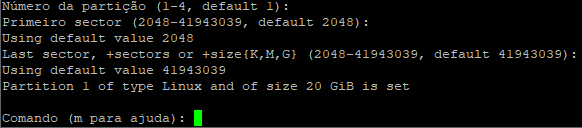 Nesse exemplo iremos utilizar o tamanho total do disco (já estão marcados como Default), pressione enter para selecionar o numero padrão da partição, pressione enter para selecionar o primeiro setor padrão, pressione enter novamente para selecionar o ultimo setor padrão.