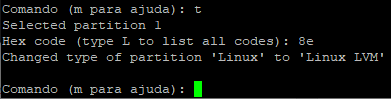 Digite “t” para escolher o tipo de partição, utilizaremos a partição do tipo LVM, o código dessa partição é o “8e”.